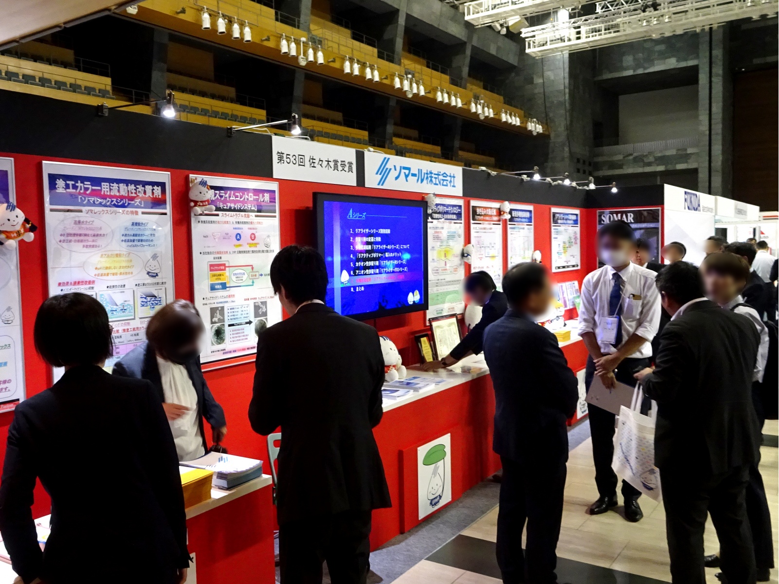 併設された展示会では歩留り剤・凝結剤のほかにスライムコントロール剤「キュアサイド」、防腐剤「ソマサイド」、流動性改質剤「ソマレックス」の他にSBラテックス、消泡剤等をブース展示しました。